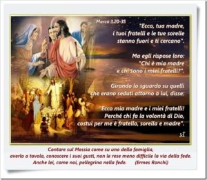 L’unica volta che Maria appare nel Vangelo di Marco è immagine di una madre che non capisce il figlio, che non lo favorisce. Lei che poté generare Dio, non riuscì a capirlo totalmente. La maggior familiarità non le risparmiò le maggiori incomprensioni.